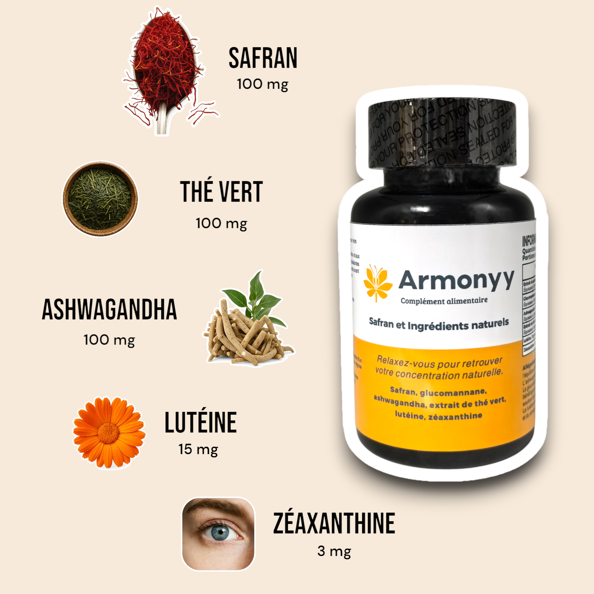Contrairement aux compléments classiques à base de safran, Armonyy a été pensé pour répondre aux besoins concrets des personnes sensibles au stress, sujettes à la dispersion mentale ou atteintes de TDAH. Une formule complète pour un esprit clair et concentré.